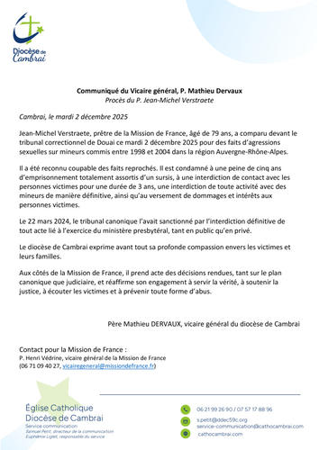 Jean-Michel Verstraete, prêtre de la Mission de France, âgé de 79 ans, a comparu devant le tribunal correctionnel de Douai ce mardi 2 décembre 2025 pour des faits d’agressions sexuelles sur mineurs commis entre 1998 et 2004 dans la région Auvergne-Rhône-Alpes.