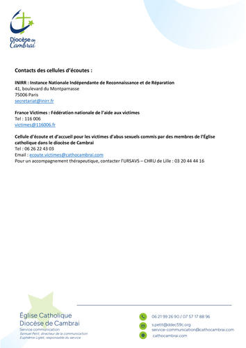 - Cellule d’écoute et d’accueil pour les victimes d’abus sexuels commis par des membres de l’Église catholique dans le diocèse de Cambrai