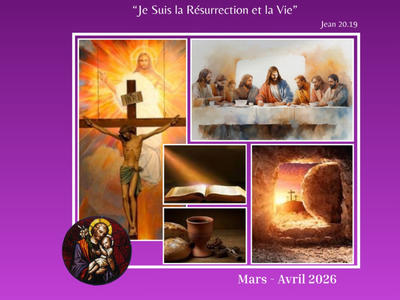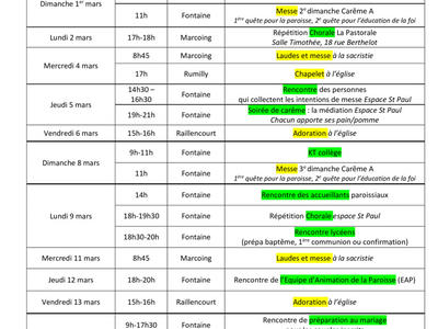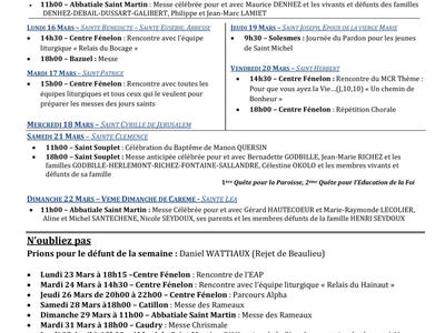 Feuille des évènement paroissiaux du mois de Mars 2026, cette feuille contient les informations relatives aux messes, temps de prière, groupes de partage, évènements de la paroisse.